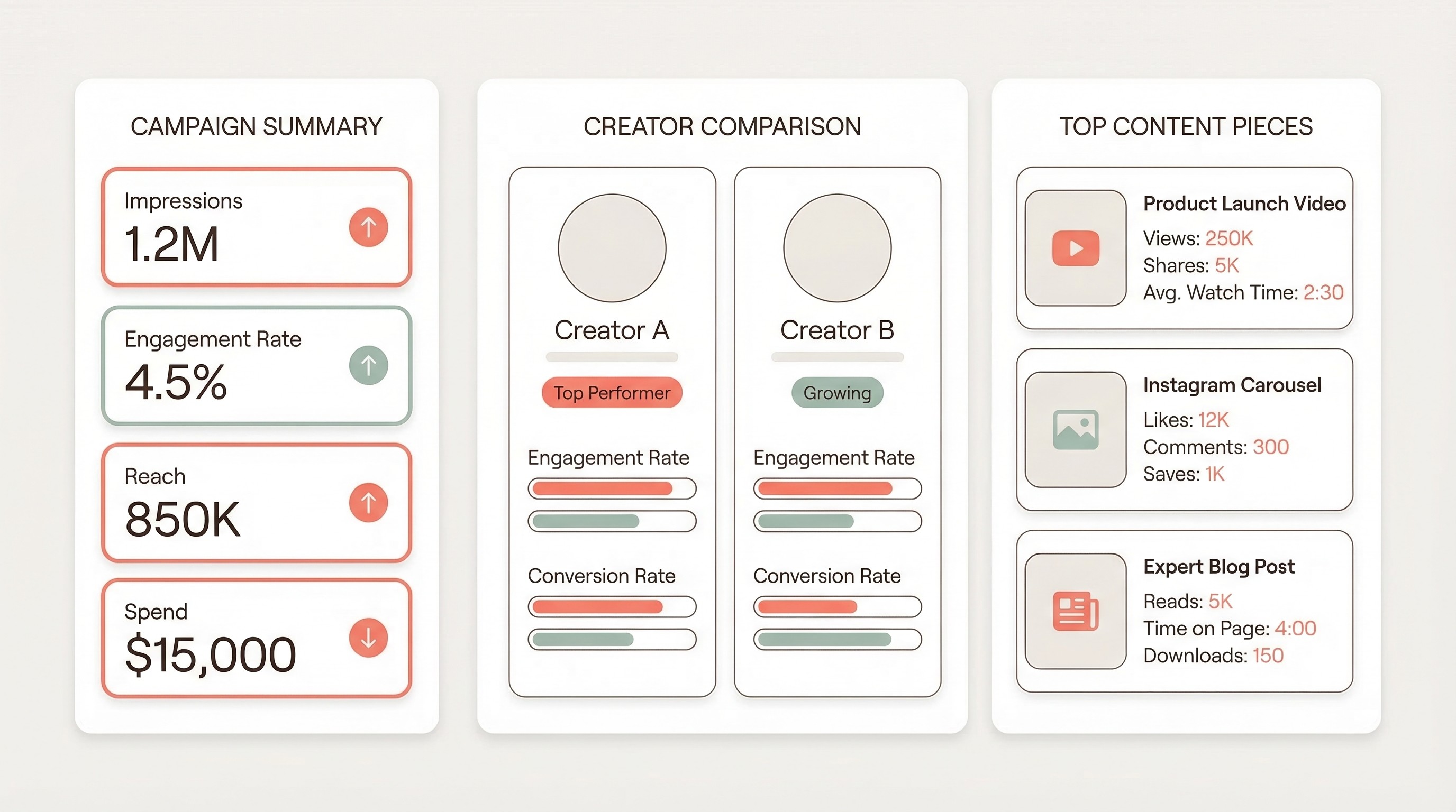 Executive summary (1 paragraph). What the campaign achieved in plain language. "The campaign reached 1.2 million unique users and generated a 3.4% engagement rate — 40% above our benchmark for beauty campaigns in this creator tier."